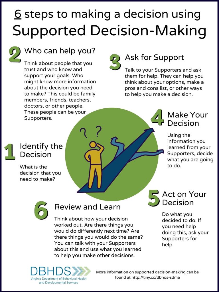 في حين أنه يجب أن يكون عمرك 18 على الأقل لإنشاء اتفاقية اتخاذ القرار المدعوم في أي عمر للمساعدة في اتخاذ الخيارات وزيادة تقرير المصير. يمكنك أيضًا البدء في عملية الاكتشاف والتحدث عن اتخاذ القرار قبل أن يتحول شخص ما 18. يستغرق تعلم الاختيار وقتاً طويلاً ويجب التدرب عليه منذ سن مبكرة. هناك أدوات يمكن أن تساعدك في بدء عملية الاستكشاف والتحدث عن اتخاذ القرار على الموقع الإلكتروني لـ DBHDS.